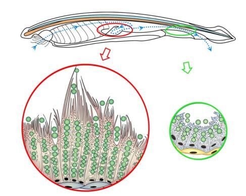 细胞内消化方式通常被认为是单细胞动物特有的原始消化方式。学界普遍认为:多细胞动物以细胞外消化方式来消化食物。陆祖宏、何春鹏师生在10余年的脊椎动物肝脏、胰腺演化起源研究中,意外发现文昌鱼消化道(特别是盲囊部分)上皮细胞能够直接吞噬藻类等食物颗粒,并且能够对其进行有效的消化、吸收和利用。文昌鱼消化道上皮细胞通过强大的消化和免疫功能基因群,不但能够直接在细胞内部把藻类降解为氨基酸、寡肽、寡糖、寡核苷酸、脂肪酸、维生素和微量元素等营养物质,还能够有效降解藻毒素等有害物质,达到直接把藻类转化为可吸收、无毒害营养物质的目的(见下图)。