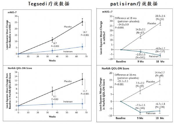 昨日,RNAi疗法开发领域的领军企业Alnylam公司的RNAi药物patisiran治疗hATTR淀粉样变性的III期临床研究也发表在同一期的NEJM期刊上。疗效数据方面,patisiran与Tegsedi相比更胜一筹,如下所示。patisiran是一种静脉注射药物,每3周一次静脉输注,Tegsedi则具有自我皮下注射的便利性,但需要每周注射一次。此外,patisiran还能够显著改善心肌病。