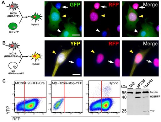 在这项新的研究中,Wong团队首先测试将小鼠结肠癌细胞或黑色素瘤细胞与巨噬细胞在一起培养是否能够导致一群自发性融合在一起的杂合癌细胞产生。他们通过寻找来自在这些杂合癌细胞中同时存在的两种细胞类型的受体荧光标记、供体荧光标记和性染色体的存在,鉴定出它们的存在。他们还利用活细胞成像捕捉到这种融合过程,并且证实这些杂合癌细胞继续发生分裂。