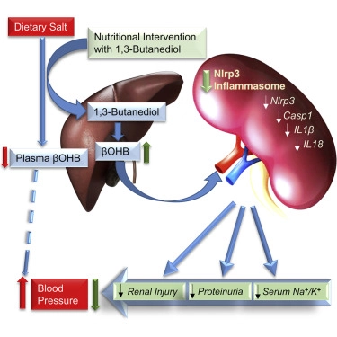 具体而言,这些研究人员给实验室大鼠摄入一种称为1,3-丁二醇(1,3-butanediol)的化学物。当这种化学物到达肝脏中时,酶将它转化为β-羟基丁酸。随后,β-羟基丁酸从肝脏进入肾脏中,在那里,经证实它降低经常与高血压相关的炎症,从而在这个过程中显著降低血压。这意味着它通过修复肾脏间接地降低血压。它可能也影响很多其他的器官。如今,他们正在研究心脏、血管、大脑和其他的器官系统。