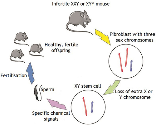 研究团队从XXY和XYY小鼠获取耳朵的组织进行培养,收集称为成纤维细胞的结缔组织细胞。他们将成纤维细胞转化为干细胞,并注意到在这个过程中,一些细胞失去了额外的性染色体。这种现象研究人员称为三体染色体丢失(trisomy-biased chromosome loss,TCL)。用已有的方法,他们使用特定的化学信号来引导干细胞变成有可能成为精子的细胞。这些细胞进入宿主小鼠的睾丸后发育成成熟精子。然后,研究人员利用成熟的精子,通过辅助生殖,培育出健康、可育的后代。