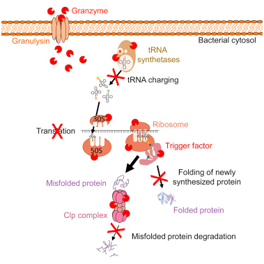 之前被称作细胞毒性T淋巴细胞的杀伤性T细胞通过产生颗粒酶B来攻击被感染的细菌。这种酶如何触发细菌死亡在此之前并未得到很好的理解。