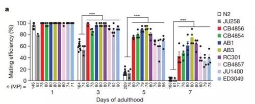 研究发现,两条基因上的DNA多态性会影响线虫的生理机能,其中一条叫做rgba-1,编码一种多肽;另一条叫做npr-28,编码一个G蛋白偶联受体。它们都会影响到雄性的性能力衰退,暗示这两条基因在衰老过程中扮演的关键角色。